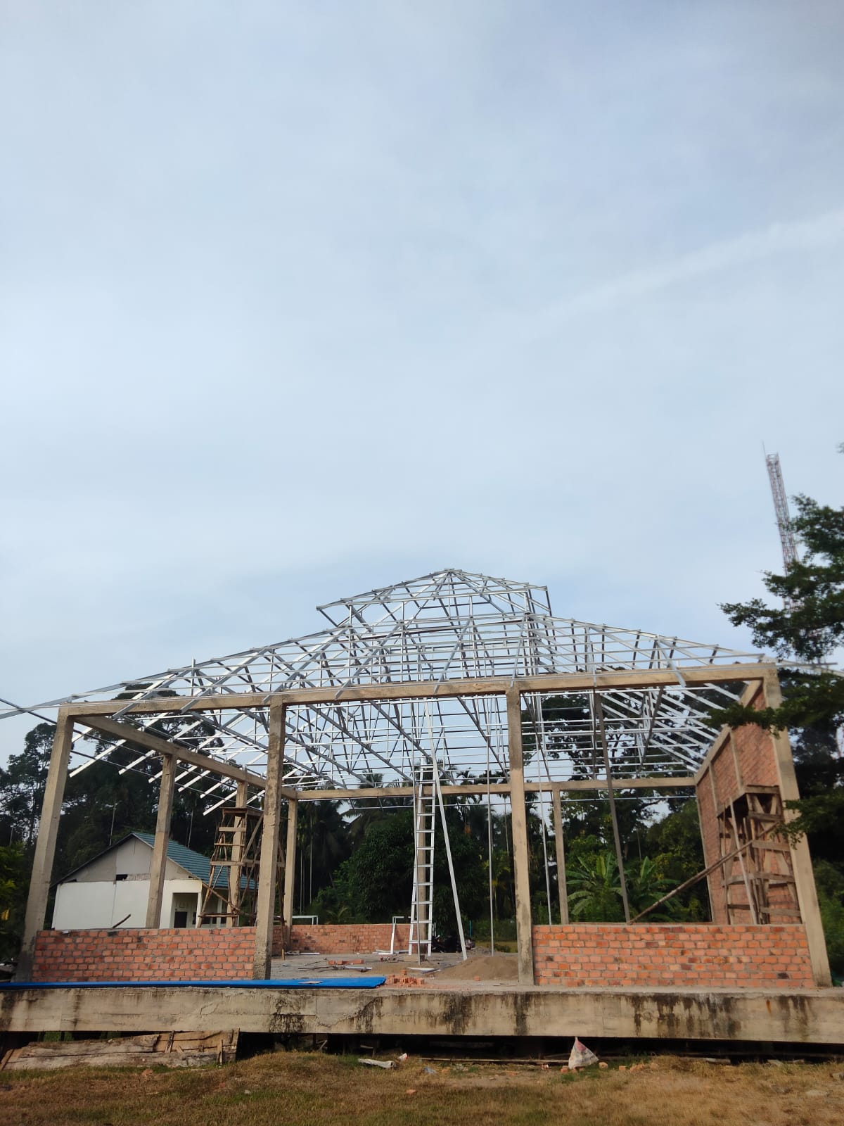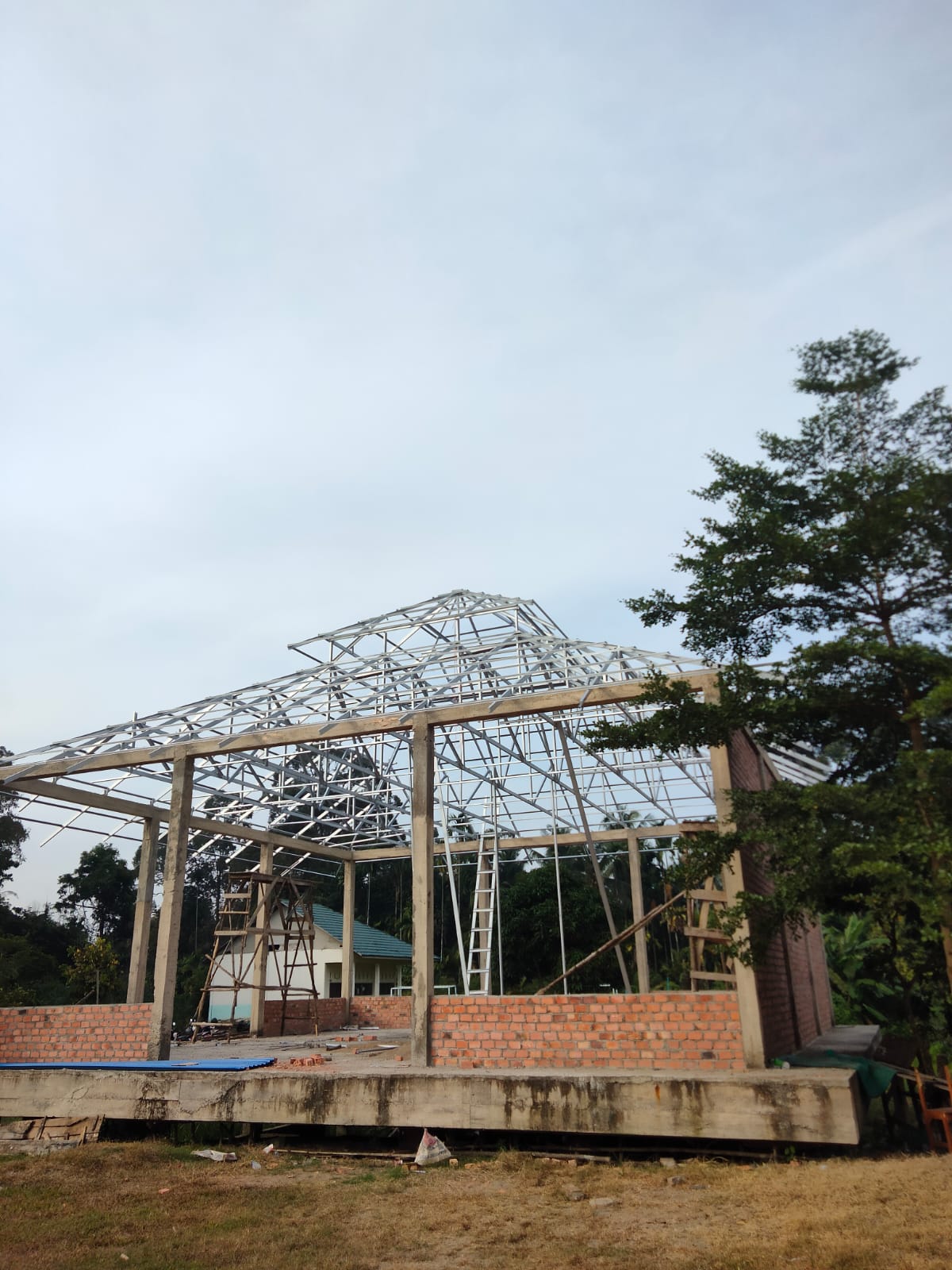 peletakan batu pertama dan pembuatan pondasi, akhirnya pembangunan Mushola Nurul Fatah MAN 3 Muaro Jambi memasuki tahap akhir pemasangan atap.