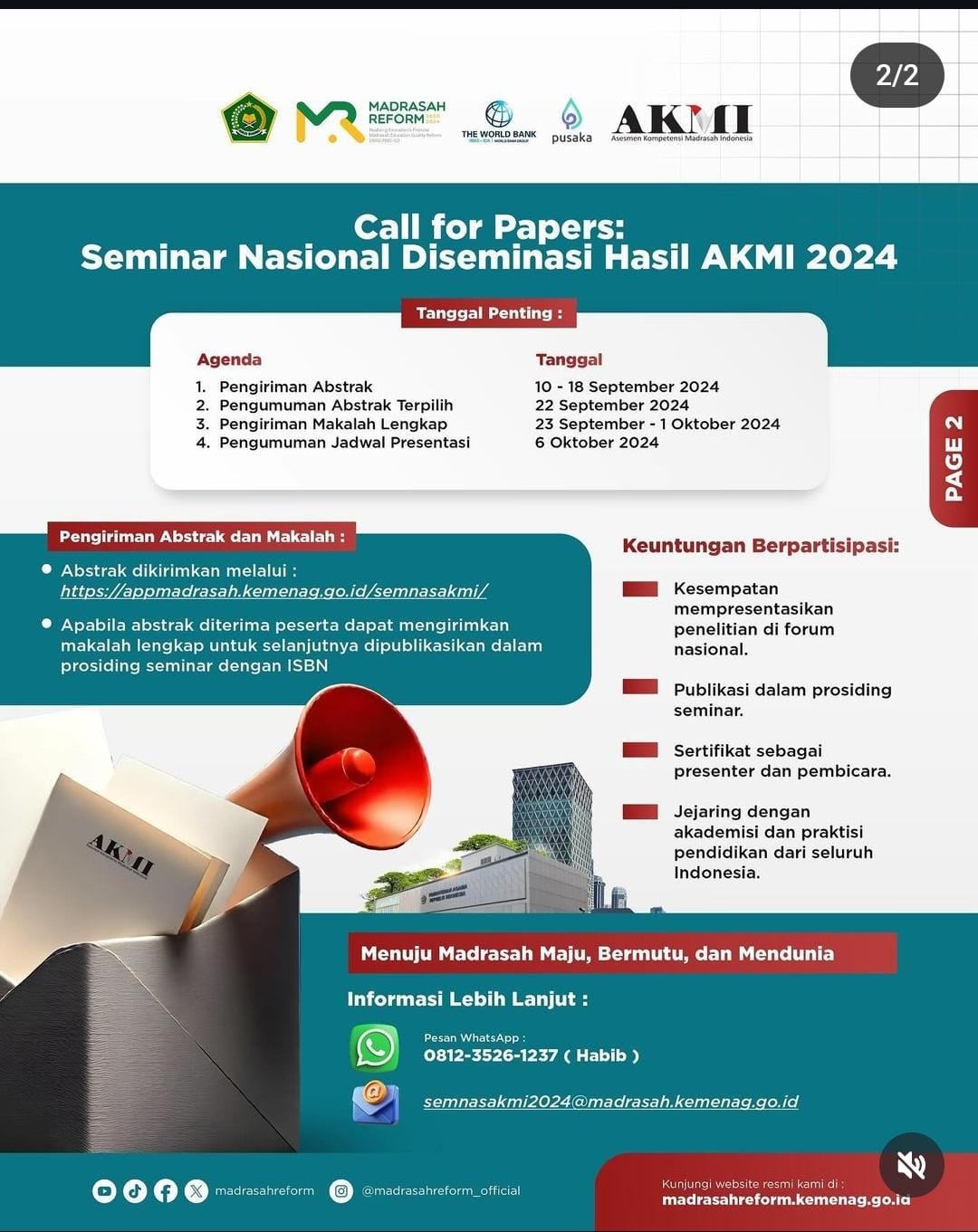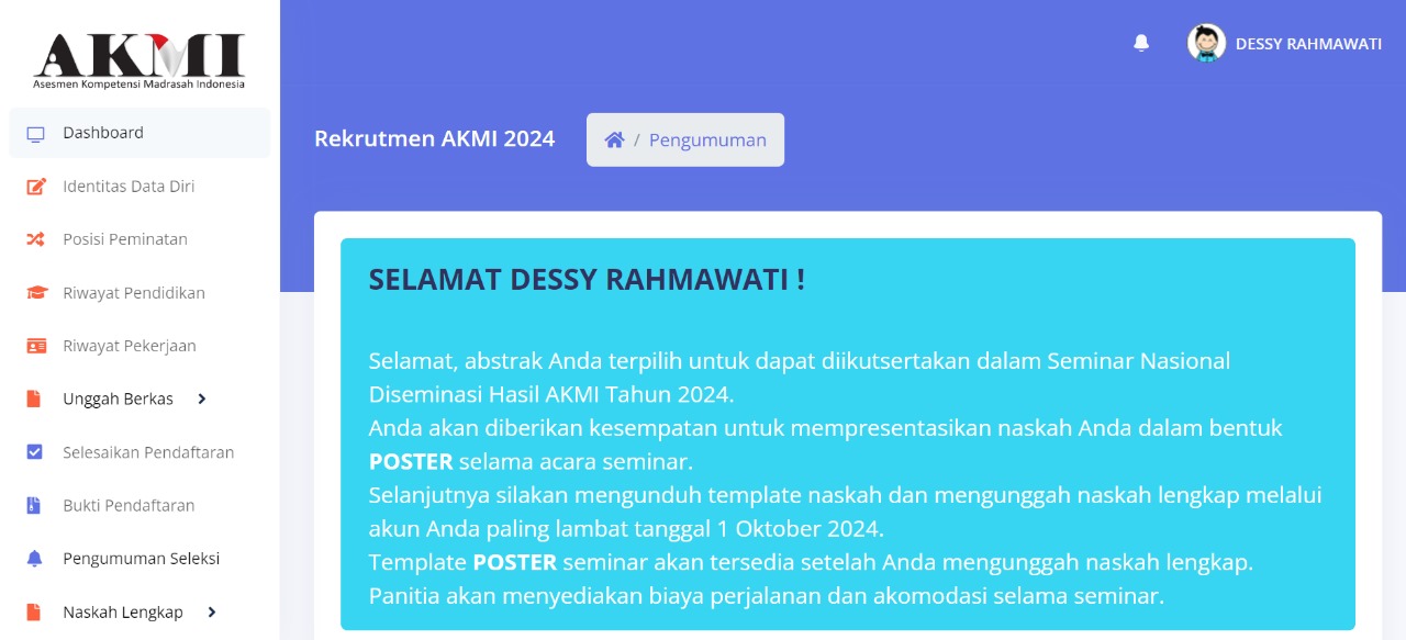 Kementerian Agama RI melalui Direktorat KSKK Madrasah mengundang para akademisi, peneliti, praktisi pendidikan, guru, dan pemerhati pendidikan untuk berpartisipasi dalam Seminar Nasional Diseminasi Hasil AKMI 2024 yang akan diselenggarakan pada tanggal 14-17 Oktober 2024 di Jakarta. Seminar ini bertujuan untuk mendiskusikan dan menyebarluaskan hasil Asesmen Kompetensi Madrasah Indonesia (AKMI) 2024 sebagai dasar peningkatan kualitas pembelajaran di madrasah.
