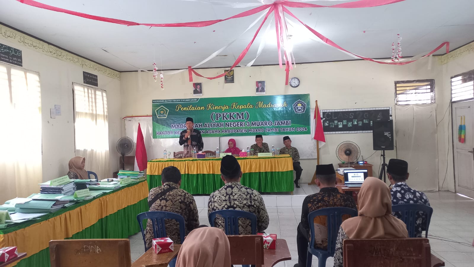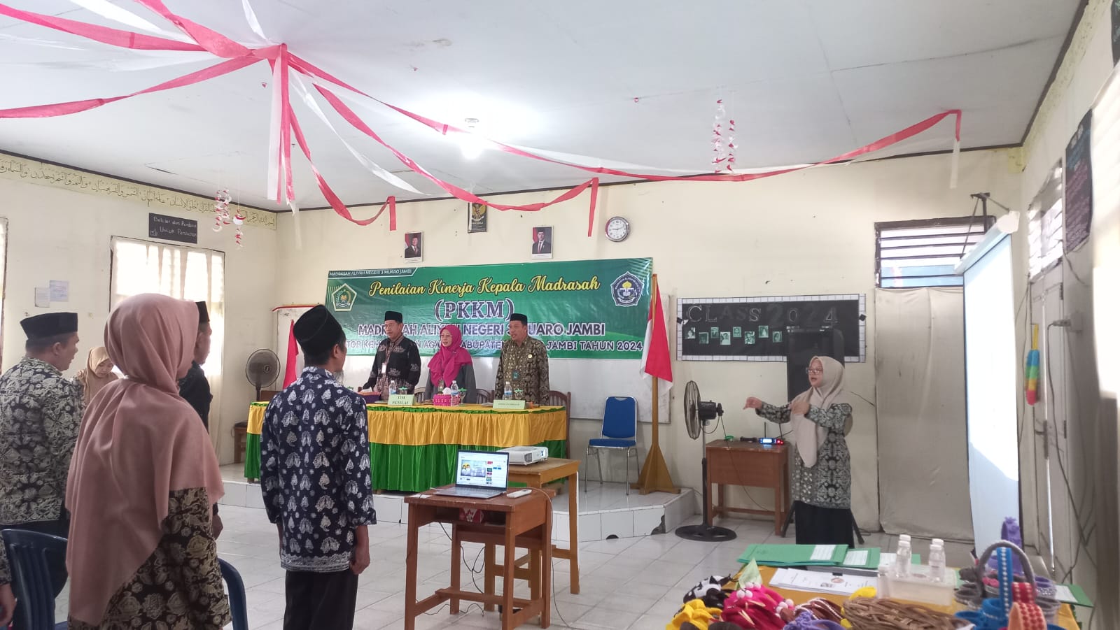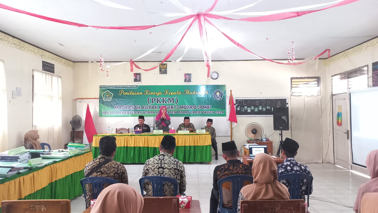Hari ini Rabu, 11 desember 2024 Penilaian Kinerja Kepala Madrasah (PKKM) di MAN 3 Muaro Jambi berlangsung dengan lancar di salah satu ruang kelas yang dipilih khusus untuk kegiatan ini. Acara tersebut dihadiri oleh wakil kepala madrasah, guru-guru, staf pegawai, serta dua pengawas madrasah yang sekaligus bertindak sebagai tim penilai, yaitu Bapak Alimuddin, S.Pd, M.Pd.I (Ketua Pokjawas propinsi Jambi) dan Ibu Dr. Aty Mulyani, S.Ag, S.Pd, M.Pd (pengawas madrasah dan juga Ketua Perkumpulan Guru Madrasah Indonesia Propinsi Jambi)