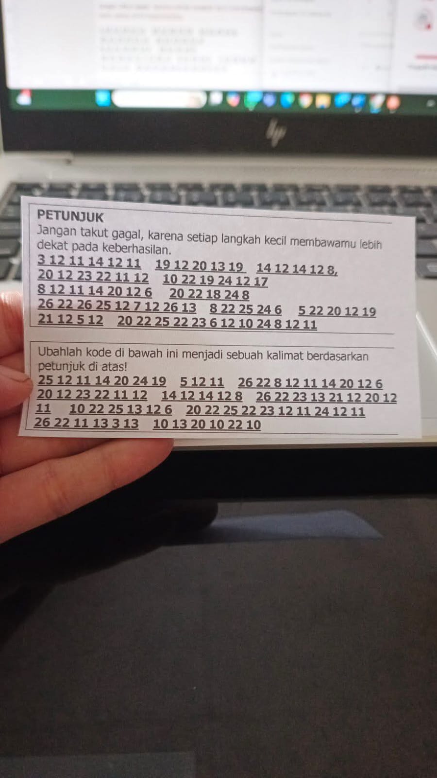 Pada kegiatan ini anak-anak diajak untuk mengolah informasi pada lembar kerja yang telah disediakan. Informasi itu berupa mendekodekan angka menjadi sebuah kalimat berdasarkan petunjuk yang telah diberikan. Harapannya kegiatan ini mematik ketelitian, fokus dan daya kritis siswa.