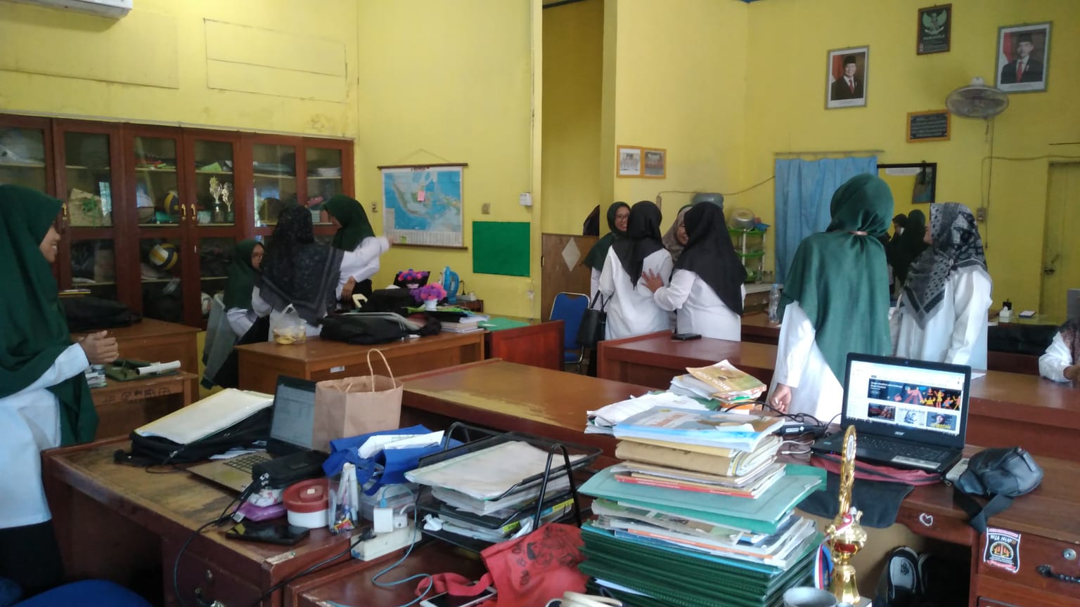 Dalam kegiatan monitoringnya, Dr. Aty Mulyani, S.Ag, S.Pd, M.Pd terlebih dahulu meninjau ruang panitia Ujian Madrasah. Beliau memeriksa daftar presensi kehadiran pengawas ruang ujian serta berdiskusi dengan panitia mengenai jalannya ujian.
