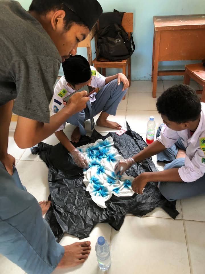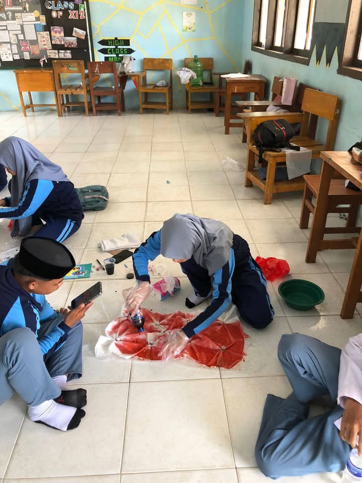 Dengan semangat dan antusias, siswa membuat batik jumputan menggunakan kain putih, karet gelang, dan pewarna kain. Mereka bebas berkreasi dalam memilih pola dan warna sesuai imajinasi masing-masing.