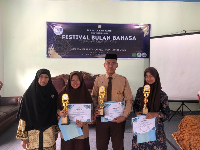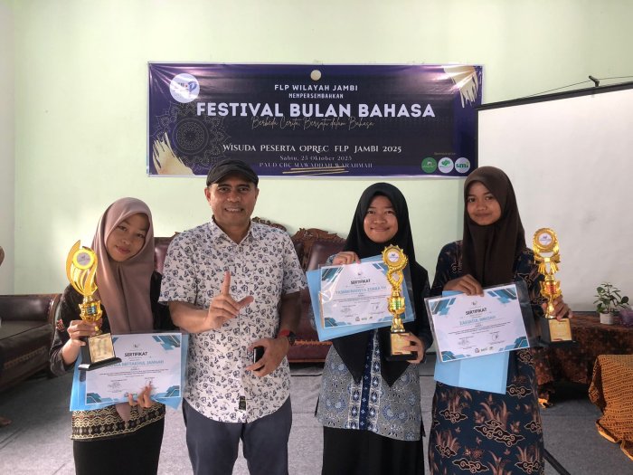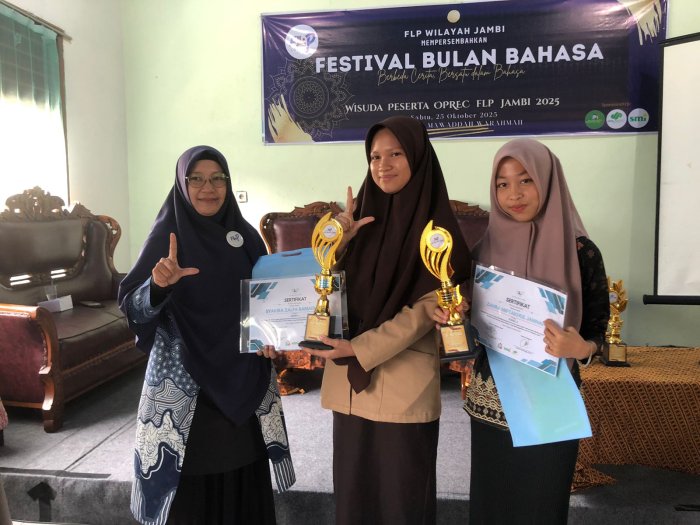Tiga siswa MAN 3 Muaro Jambi berhasil meraih prestasi membanggakan dalam Festival Bulan Bahasa yang digelar oleh Forum Lingkar Pena (FLP) Provinsi Jambi. Kegiatan ini berlangsung secara daring pada 7 hingga 20 Oktober 2025, dengan acara puncak dan pengumuman pemenang diadakan pada Sabtu, 25 Oktober 2025, di TK CBC Kota Jambi.