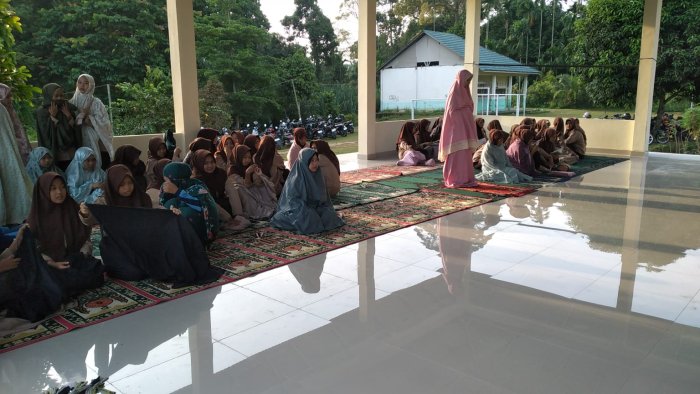 Bertempat di area madrasah yang telah disiapkan, para siswi tampak tertib melaksanakan shalat Dhuha secara berjamaah. Usai shalat, kegiatan dilanjutkan dengan tadarusan Al-Qur'an yang diikuti dengan suasana tenang dan penuh kekhusyukan. Lantunan ayat-ayat suci Al-Qur'an menggema, menciptakan nuansa religius yang menyejukkan hati.