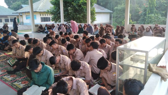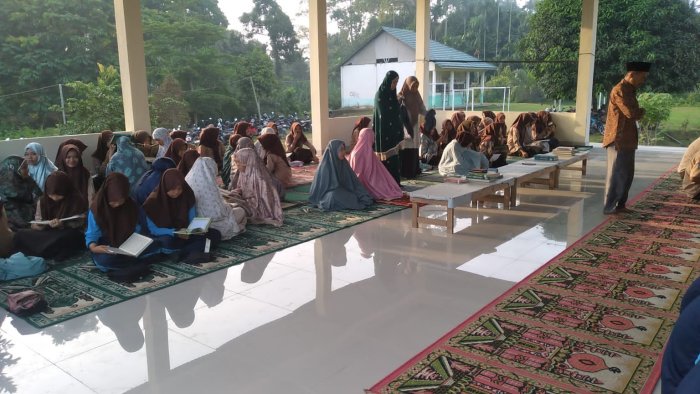 Kegiatan shalat Dhuha dilakukan secara individu di masjid madrasah, kemudian dilanjutkan dengan membaca Al-Qur'an bersama. Para siswa tampak khusyuk membawa mushaf Al-Qur'an masing-masing, didampingi oleh guru-guru yang mengawasi dan membimbing jalannya kegiatan. Suasana religius dan tertib terlihat selama pelaksanaan ibadah ini.